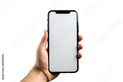 Hand holding the Phone with a mockup white blank screen isolated PNG