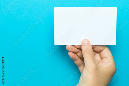 Hand holding up a note card on a blue background