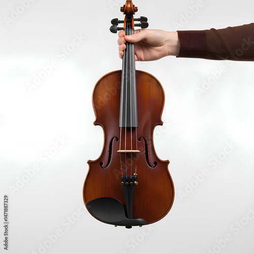 Hand holding violin mockup, isolated on white. Classical musical instrument template. Elegant string music concept for orchestra or performance visuals.