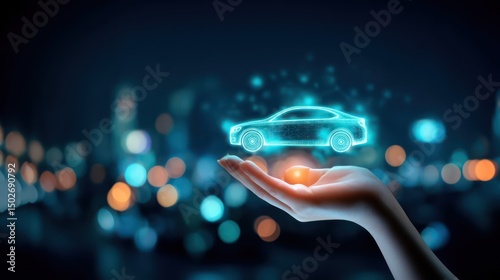 Hand holds glowing car icon hologram on dark background, showing futuristic transport and online ride service in digital on demand ride services