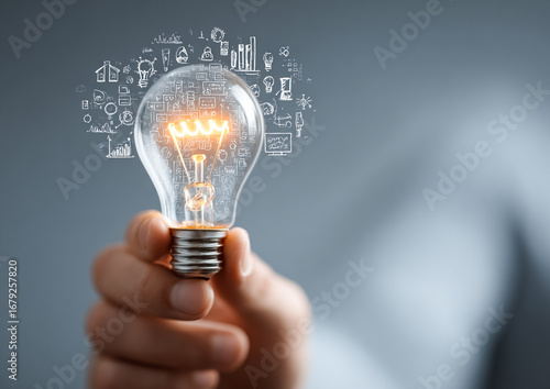 Hand holds lightbulb with sketches. Symbolizes innovation, ideas, solution, concept, success. Use for marketing, web, design, editorial.