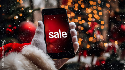 Hand in Santa glove holds smartphone displaying sale message, with festive holiday lights and snowflakes in background