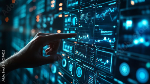 Hand interacting with a Data Management System (DMS) and Business Analytics concept, featuring servers linked to a dashboard.