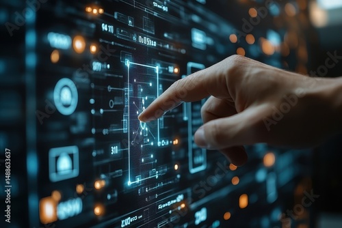 Hand interacting with a digital interface displaying data and technology elements in a modern environment