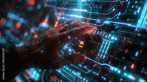 Hand interacting with a digital interface, representing futuristic touch technology and human-computer interaction.