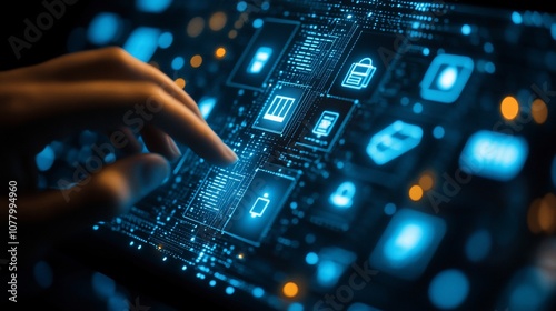 Hand interacting with a digital interface, showing icons for various apps and services.