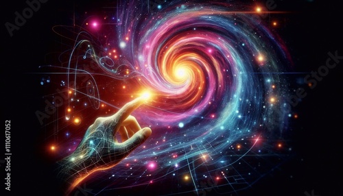 Hand interacting with a glowing, swirling galaxy-like vortex, symbolizing cosmic creation and futuristic technology