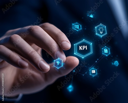 Hand interacting with a holographic KPI interface, showing key performance indicators and data points