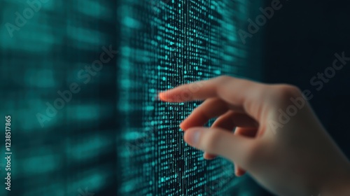 Hand Interacting with Digital Display of Binary Code, Illustrating Artificial Intelligence and Misinformation Filtering for Fake News Alerts