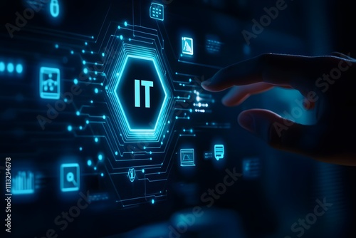 Hand Interacting with Digital IT Interface, Futuristic Technology and Information Systems Concept