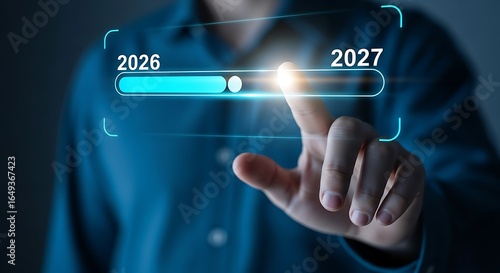 Hand interacting with digital progress bar from 2026 to 2027 with glowing indicator future advancement
