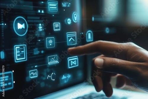 Hand interacting with futuristic digital interface and icons isolated on transparent background
