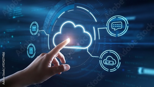 Hand Interacting with Glowing Cloud Technology Interface, cloud computing copy space, copy-space background, tech copyspace background