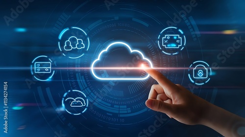 Hand Interacting with Glowing Cloud Technology Interface, cloud computing copy space, copy-space background, tech copyspace background