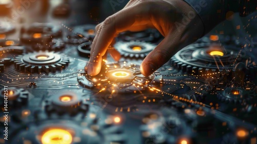 hand interacting with glowing mechanical gears with sparks and futuristic circuit board elements conveying precision and technology