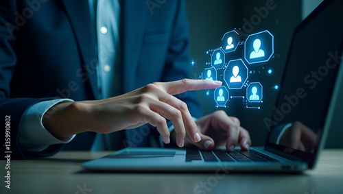 Hand Interacting with Holographic AI Chatbot Device on Laptop: Exploring Smart Assistant Automation and Intelligent Assistance Icons in a Futuristic Business Concept with Empty Space