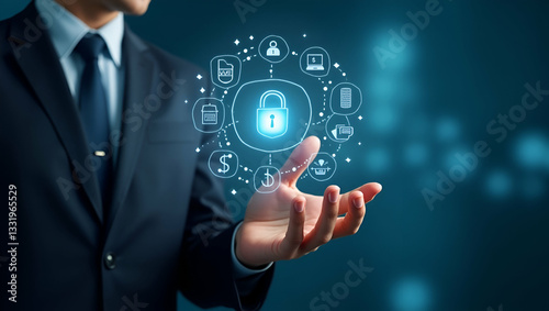 Hand Interacting with Holographic Digital Banking Interface: Exploring Financial Services, Data Security, Currency Exchange, and Payment Icons in a Conceptual Stock Photo with Empty Space