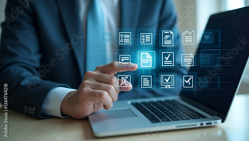 Hand interacting with holographic digital form checklist interface showing checkboxes documents survey icons on laptop in empty space concept as Hand interacts with holographic digital form checklist