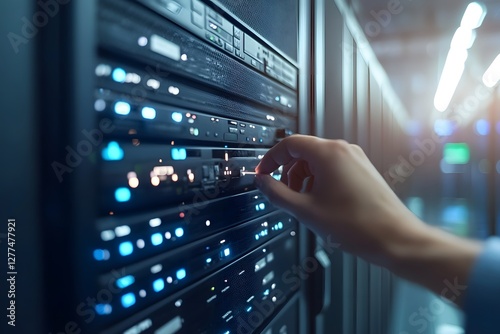 Hand interacting with server rack, data center