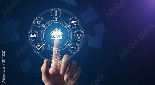 Hand interacting with smart home interface showcasing connected devices and digital technology