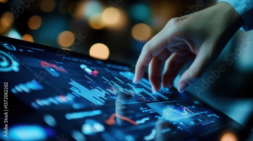 Hand interacts with digital dashboard. A hand interacts with a futuristic touchscreen display showing various graphs and charts