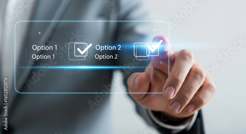 Hand interacts with transparent digital interface displaying options and checkmarks, symbolizing choice, selection, decision-making in business or technology