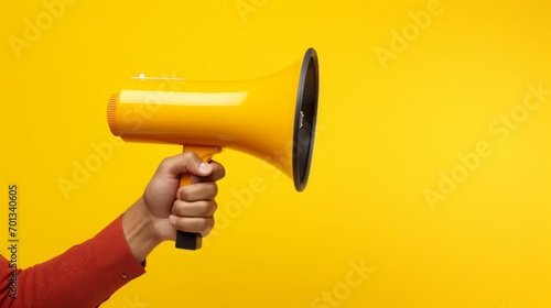 Hand is holding a megaphone, yellow background, copy space, 16:9