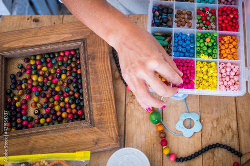 hand made creations jewels - Top view of woman doing jewelry beads accessories with colorful cords - home work job concept people - diy hobby indoor at house for female