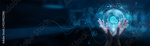 Hand man holding of global supply chain network connection, optimizing logistics, inventory management, demand forecasting, and supplier collaboration, ensuring seamless operations, cost efficiency.