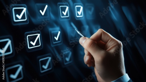 Hand marking completion of tasks on a digital checklist with glowing check marks in a dark setting