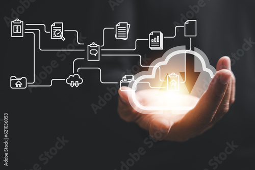Hand of a businessman confidently holds the cloud computing icon, symbolizing the transformative cloud technology. Data transfer and online storage for business network on the internet.