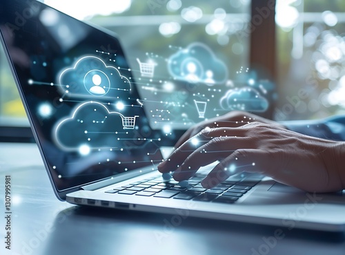 Hand of a businessman using a laptop computer with digital cloud technology and social media icons on a virtual screen