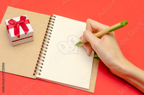 hand of a girl who draws a heart in a notebook, next to a gift box on a red background. concept of Valentine's Day, holiday