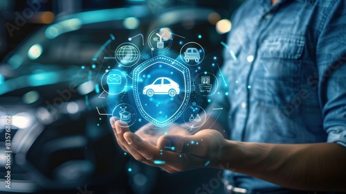 Hand of a mechanic holding a virtual shield with car service icons and checking, the customer service and repair concept.
