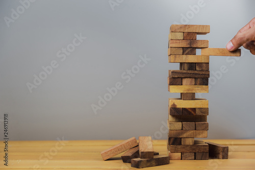Hand of businessman pulling out or placing wood block on the tower, plan and strategy in business.for background - Image