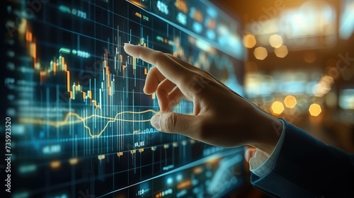 Hand of businessman touching touching a transparent monitor screen showing a profit growth chart is developing a business investment plan. Generative AI.