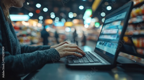 Hand of Businessman use computer in supermarket with Blur Background of product display on shelves in Supermarket