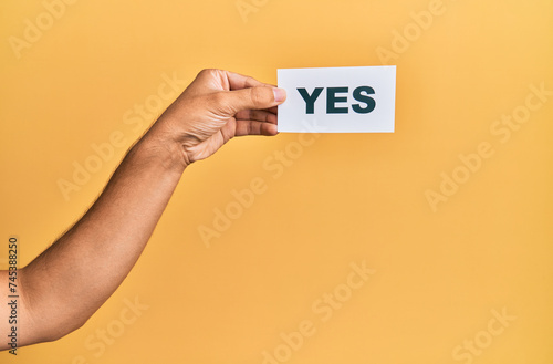 Hand of caucasian man holding paper with yes word over isolated yellow background