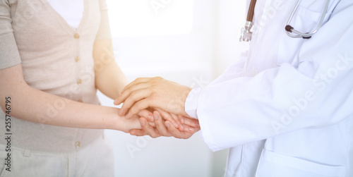 Hand of doctor reassuring her female patient. Medicine and health care concept