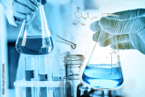 hand of scientist holding flask with lab glassware in chemical laboratory background, science laboratory research and development concept