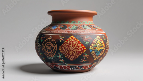 Hand painted decorative ceramic vase featuring intricate geometric patterns and vibrant colors on a light gray background