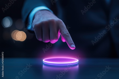 Hand pointing at a glowing neon interface on a dark background. Concept of technology and futuristic innovation.
