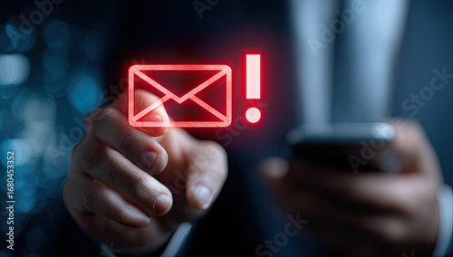 Hand pointing at a glowing red email symbol with an exclamation mark, implying a warning or notification