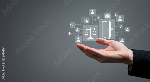 Hand presenting digital justice concept; scales of justice, open door, network icons.