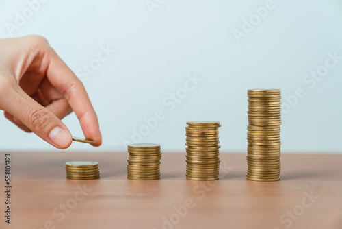 Hand putting coins on stack on table. concept saving money and financial growth.