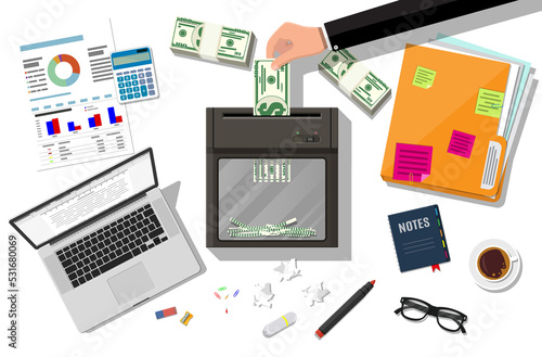 Hand putting dollar banknote in shredder machine