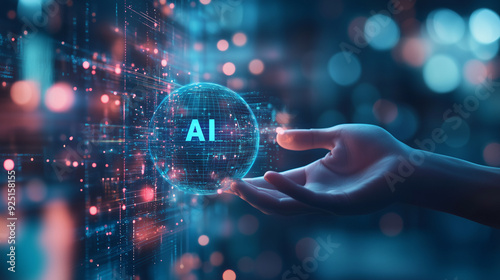 Hand reaching towards a digital AI globe surrounded by interconnected data streams. Conceptual representation of artificial intelligence and technology in a digital environment.
