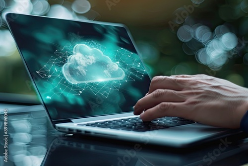 Hand showing laptop computer with cloud network. Cloud computing technology and online data storage for business network concept