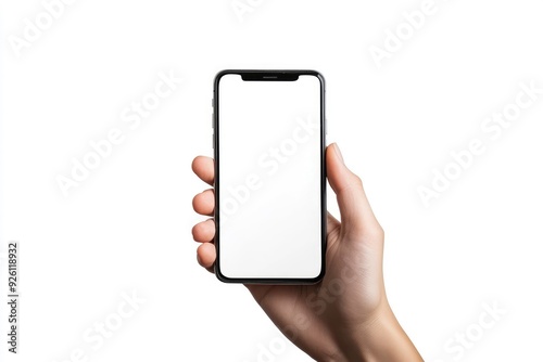 Hand showing smartphone with blank screen isolated on white background with generative ai