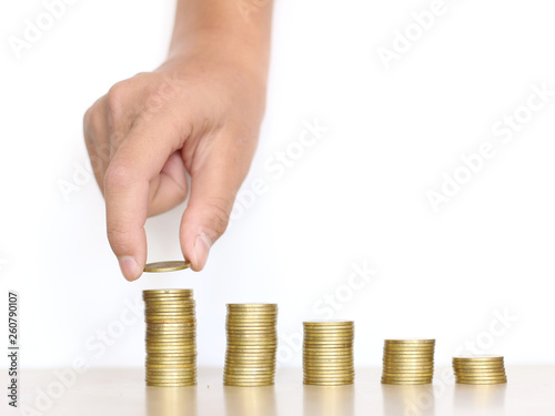 Hand stacking coin on desk, Invest your money to get in come,growing business and future concept